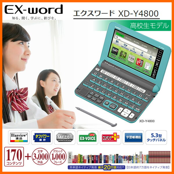 XD-Y4800 カシオ電子辞書 CASIO エクスワード 高校生モデル 製品仕様 品番 XD-Y4800 表示 5.3型タッチパネル(5.0型 528×320ドット TFTカラー液晶) 外形寸法 幅148.0×奥行105.5×高さ15.7mm(閉時、最薄部) 高さ18.5mm(閉時、最厚部) 質量 約265g(電池込み) 本体メモリー 約100MB 電源 ・単3形アルカリ乾電池LR6(AM3)2本または単3形eneloop(エネループ)2本または単3形充電式EVOLTA(エボルタ)2本 ・パソコンや別売USB-ACアダプターからのUSB給電 付属品 タッチペン1本、単3形アルカリ乾電池2本 特徴 ■高校の勉強から大学受験まで使いたい 予習・復習から受験まで、高校3年間をバックアップ 毎日の予習復習から大学受験まで、学力・成績アップに役立つ充実の収録内容。定評のある出版社のコンテンツを揃え、安心して学業に専念できます。 ■「英会話スキット · トレーニング」を収録。対話形式のネイティブ発音と文章(スキット)を収録しており、相手のセリフに答えるように発音 · 録音し、聞き比べて繰り返し練習することで、実践で役立つ英会話力を磨くことができる ■毎日の学習がはかどる 高校学習に定評のある出版社のコンテンツを厳選収録。 予習・復習はもちろん、大学受験まで活用でき、高校学習の強い味方になってくれる。 ■英語力強化をサポート 英単語、英熟語、英文法。基礎固めから実践力まで全面的に強化。 苦手を克服して、受験に通用する英語力を身につけよう。 ■多角的な学習を支援 画面は見やすく、ネイティブ発音は豊富に。便利な学習機能やスピーキング機能も搭載。 「見る」「聞く」「書く」「話す」を取り入れた学習方法で、確かな実力を身につけよう。 ■検定試験などを応援 エクスワードには、英検、TOEIC、TOEFL、漢検の対策に役立つコンテンツを豊富に収録。 検定合格、スコアアップなど、目標達成に向けたチャレンジを応援する。 ■持ち歩きにぴったり 毎日持ち歩いて、気軽に使えるエクスワード。 軽量ながら丈夫で電池長持ち。 入手が簡単な単3形乾電池だから、不意の電池切れの際も安心。 収録コンテンツ 収録コンテンツ一覧はコチラ⇒ 【楽ギフ_メッセ入力】【楽ギフ_のし宛書】[電子辞書 送料無料][電子辞書 高校生][高校生向け][高校学習][大学受験] 【商品ラインナップ・関連商品】XD-Y4800 カシオ電子辞書 CASIO エクスワード 高校生モデル カシオ2016年モデルの電子辞書XD-Y4800、今年7月に発売20周年を迎えるEX-word(エクスワード)”シリーズの新製品。 従来機種のXD-K4800(2015年1月発売)より英語学習におけるボキャブラリー、リスニング、スピーキングの進捗状況を グラフで確認できる新機能を搭載。従来の商品よりも大きく異なるポイントは、以下の3つです。 ●英語学習の進捗状況を確認できる新機能“English Training Gym(イングリッシュトレーニングジム)”を搭載 ●使いやすさを追求しホーム画面を刷新。ホーム画面に複数辞書検索が可能な検索ウィンドウを追加 ●業界初のスマートフォンやタブレットとの連携サービスを開始 近年、調べるという辞書としての役割に加え、参考書や問題集、動画やラジオ英語講座を収録し、学習ツールとしての 役割を両立!中でもネイティブ発音によるスピーキングやリスニングなど英語学習をサポートするコンテンツが好評♪ 予習・復習はもちろん、英語の対話力強化・大学受験まで活用でき、高校学習の強い味方になってくれる事、間違いなし! >>詳細を見る