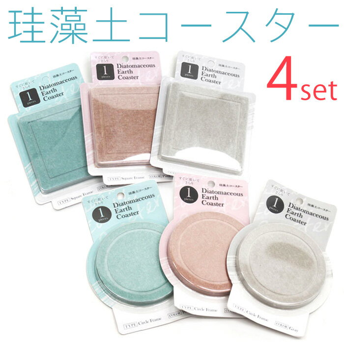 珪藻土 コースター 【スクエアタイプ】【サークルタイプ】4枚売り 抜群の吸水力の「珪藻土」で作られたコースターです。 コップ等の水滴をぐんぐん吸水!「アッ!」という間に乾燥します。 珪藻土のコースターがあれば布やコルクのコースターのように、何度も交換したり乾かす手間がありません。 【珪藻土とは】 珪藻土は珪藻(植物性プランクトンや藻など)の殻が化石化して、約1000万年前に地球の海や川、湖に堆積したものです。 表面に微細な穴( 細孔)を持っており、粒径の平均径0.05mmに対し、0.1μ〜0.2μという超微細な穴が無数に空いています。 この穴が水分を吸収したり放出したりすることで自律的な調湿作用を行います。 古くからこの珪藻土を使い、七輪やレンガの材料として使われていたり、 近年では珪藻土の持つ自律作用を生かし壁材としても利用され、また、ビールやお酒の濾過の材料としても利用されています。 直径約9cmx厚さ約0.9cm ■生産地:中国 ■素材・成分:珪藻土・植物繊維 ■パッケージ:ブリスターパック入り(フック穴付き) カラー:グレー・ピンク・ブルー ※凹凸のない、平らな場所でご使用ください。破損の恐れがあります。 ※製造上、わずかに反りのでる場合があります。反った状態で使用すると破損の恐れがありますので、 ご使用においてご注意ください。 ※製造中に白い模様や、斑点が出る場合、軽微な欠けがありますが、製品には問題はありません。 また、吸水力にも影響はありません。 ※界面活性剤を含む洗剤などのご使用はお避けください。目づまりの原因となります。 ※吸水力が落ちた場合は紙やすりなどで薄く削ると回復致します。 ※通常の使用では色落ち(移り)しにくくなっていますが、こすれたり、 長時間濡れる状態で放置した場合、まれに色落ち(移り)することがあるのでご注意ください。