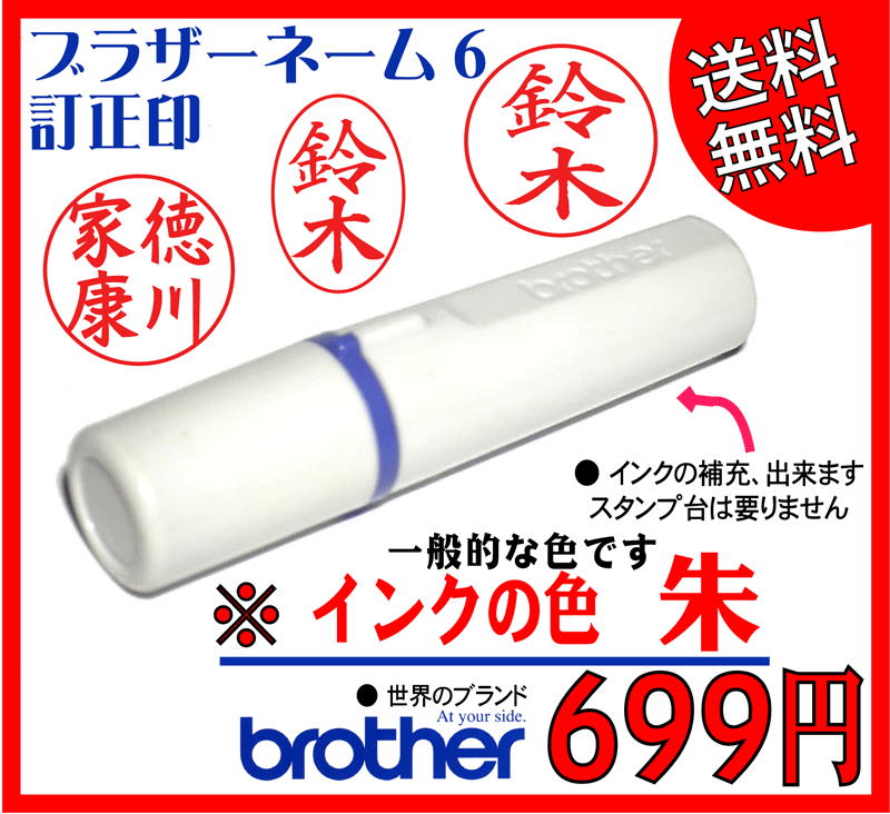 ■ 商品概要 ■ 送料 【送無】ブラザーネーム6【朱】訂正印 ■brothe/rシャチハタ式/印鑑/はんこ ================================= ◆定形・定型外郵便【送料 0 円無料】(保証無し) ◆レターパックプラス510 510円 ≪追尾有り≫ ★ インク色 【朱】円の直径は、6mm一般的なシャチハタサイズです、 ★ 初期インク約5,000回捺印可能、インク補充可能、耐久性約50,000回、 (数値メーカー調べご使用の環境、状況に応じて変動する事があります) (文字数、書体、等々に依って、インクの消耗は、異なります) ★ 600dpi超高画質、速乾性インク、とても、鮮やか、綺麗な印影です、 ★ 特殊な、文字、記号等、一部作成できない場合もござます、 必ず、ご注文前に、ご相談願います、 その他の色 ★一般的に、ネーム印は【朱】ですが、色々な、使い分けが、出来ます用、 色違いをご用意致しました、クリックすると開きます、 ご注文の場合は、お手数にて、御座いますが、各々、商品事に、ご注文願います、 ■ 文字配列見本 ■ 書体見本(1)〜(25)ご希望の書体を、お選び下さい、 ★書体文字に因って、文字の形状は、各々、異なります、はらい・点・略されたり、くっついたり、離れたり、等々、 多分に、異なります、書体文字の特色ですので、ノンクレーム、ご理解願います、 ■別売 インク※ 補充用、予備に、如何でしょうか、 下記、画像を、クリック致しますと、表記致します、 ■別売 インク※ 補充用、予備に、如何でしょうか、 下記、画像を、クリック致しますと、表記致します、 ■ ご注文の流れのご案内 送料のご案内 ◆定形・定型外郵便【送料 0 円無料】(保証無し) ◆レターパックプラス510 510円 ≪追尾有り≫ ■ 発 送 (注意事項) 2営業日以内の発送となります、土日、祝祭日、除く、 ※定型・定型外郵便(破損・商品未着・配送状況追跡・日時指定) 補償一切無し、商品はポスト投函となります、 ◎スピード、安全性、ご希望の方は、レターパック プラス510【510円】にて、願います ◆包装は、お品物、其のまま、封筒での発送です、 ■ その他 ■ (注意事項) ※領収証発行できます(必ず、ファーストメールにて)ご記入ください、 宛名のご指定が無い場合は(宛名上様)と成ります、 ※領収証発行PDF添付メールに、成る場合が御座います、ご理解願います、 ※誤字、欠陥品の場合、送料当社負担で返品承ります 商品到着後7日以内にご連絡返送してください