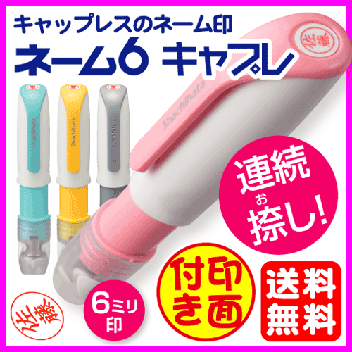メーカー希望小売価格はメーカーカタログに基づいて掲載しています ※発送方法・支払方法の詳細につきましては、お支払い・送料でご確認下さい。 「ネーム6キャプレ」は、キャップのいらないワンタッチ式はんこで、一般的なはんこよりもひとまわり小さい6ミリ丸のネーム印です。 ネーム6キャプレ」はキャップを外す手間なく、片手でカンタンになつ印することができます。 複数の書類に連続してなつ印したり、印面を露出した状態で固定することで狙い捺しができるなど、なつ印シーンに合わせた使い分けも可能です。 使わない時は右に回すとロックができるので、持ち運び時にも安心です。 また、ストラップ穴や携帯用クリップがあるので、携帯に便利です。 【商品特長】 1.キャップいらず!なつ印動作で開閉するウィングシャッター機構を採用 2.なつ印シーンに合わせて「連続捺し」「狙い捺し」の使い分けが可能。 3.携帯に配慮した「ワンタッチロック機構」「携帯用クリップ」「ストラップ穴」 4.インキ補充ができるので、繰り返し使うことができて経済的です。 ※ネーム印は補充なしで約3000回捺せます。 【商品仕様】 ・商品名 シヤチハタ ネーム6キャプレ ・文字書 10書体より選択可能 ・印面サイズ 直径6ミリ ・インキ色 4色から選択可能 ・インキ質 顔料系(長期保存・耐久性に優れています) ※補充インキは別売りとなっております 注文方法と注意点 ●旧字・外字の使用をご希望のお客様は「旧字コード表」をご利用下さい。 ●作成する印面内容が注文者名と異なるお客様、複数ご購入されるお客様は、商品を買いカゴに入れて「買い物ステップ」最後の「注文確認ページ」にある「備考欄」に印面内容をご記入ください。 ●画像はお客様の環境により、実際の商品と色が若干異なる場合がございます ご挨拶 この度は、おんらいん工房 楽天市場店をご利用いただき誠にありがとうございます。 当店ではシャチハタ製品から個人印鑑、法人印鑑まで様々なはんこ・印鑑を取りそろえております。送料無料商品や、ポイント10倍など楽天企画の際にはお得商品(ポッキリ商品、訳あり商品)を提供しております。 個人印鑑は実印・銀行印・認め印(認印)・角印・訂正印・ゴム印・スタンプ印・シャチハタ(ネーム印、ネーム9他)などがございます。 法人印鑑は会社印(代表者印/役職印)・社印セット・住所印・設立セットがございます。 印材も、本柘・アグニ・黒水牛・オランダ水牛・チタン・カラフルでお洒落な可愛い(かわいい)ハンコなど、幅広い商品がございます。 出産祝いや結婚祝い、卒業祝い、就職祝い、進学祝い、願書用、履歴書用、ギフトとしておすすめのおしゃれはんこや和柄のはんこもございますので是非ご覧下さい。 また、判子の他アンティークスタンプ、携帯ストラップなどの商品もご用意しております。 お急ぎの方には便利なあす楽対応商品もございます。