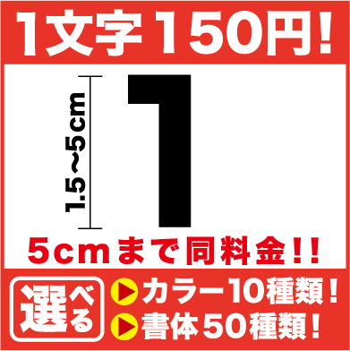 数字のカッティングステッカーです。 書体と色、一文字あたりの大きさを選んで、欲しい文字でカンタンセミオーダー! 一文字分のお値段となります!ご希望の文字数を買い物かごに入れてください! ご注文の際には備考欄に希望の文字を忘れずにご記入ください! 句読点やハイフンなども一文字としてカウントされます。 文字だけが残る防水カッティングシートステッカーです。 枠などがついていないスタイリッシュな仕上がり! 車体に貼られる場合は剥しにくいのでご注意ください。 縦や横にステッカーを繋げたい、選択肢にないサイズが欲しい、一文字ずつバラバラにしたい、○○cm以内に収めたい、など、細かいご希望がある場合にはご注文時備考欄にご記入ください。
